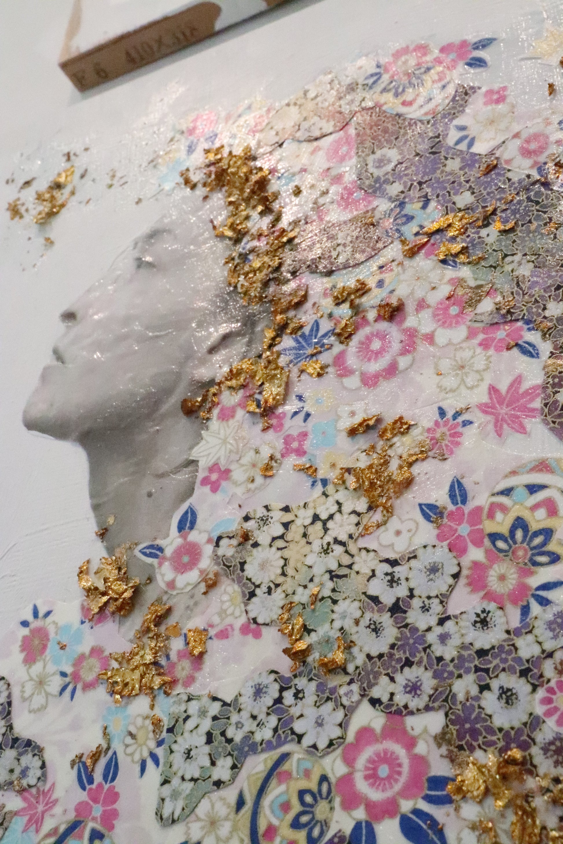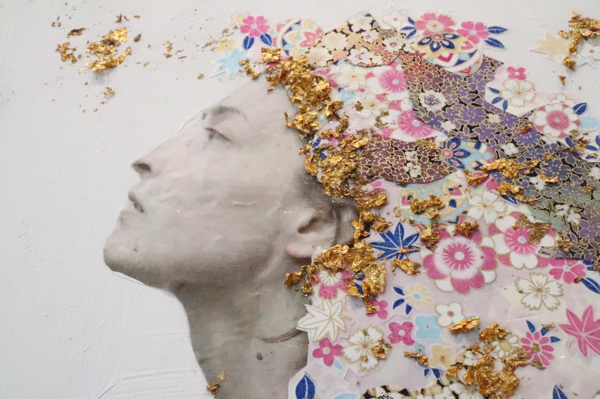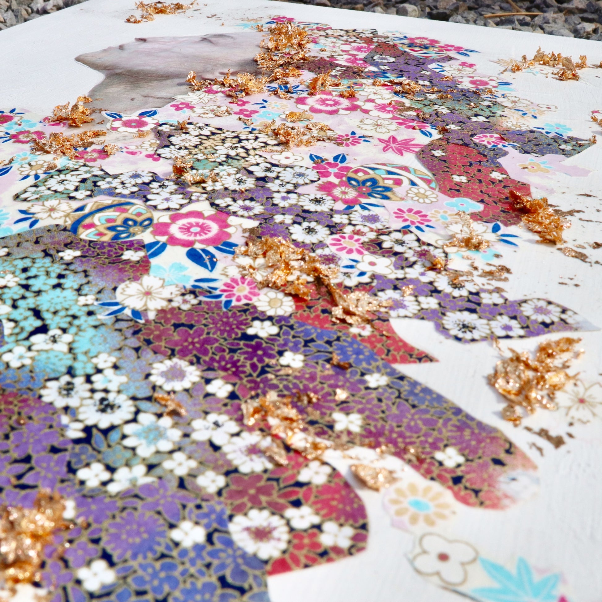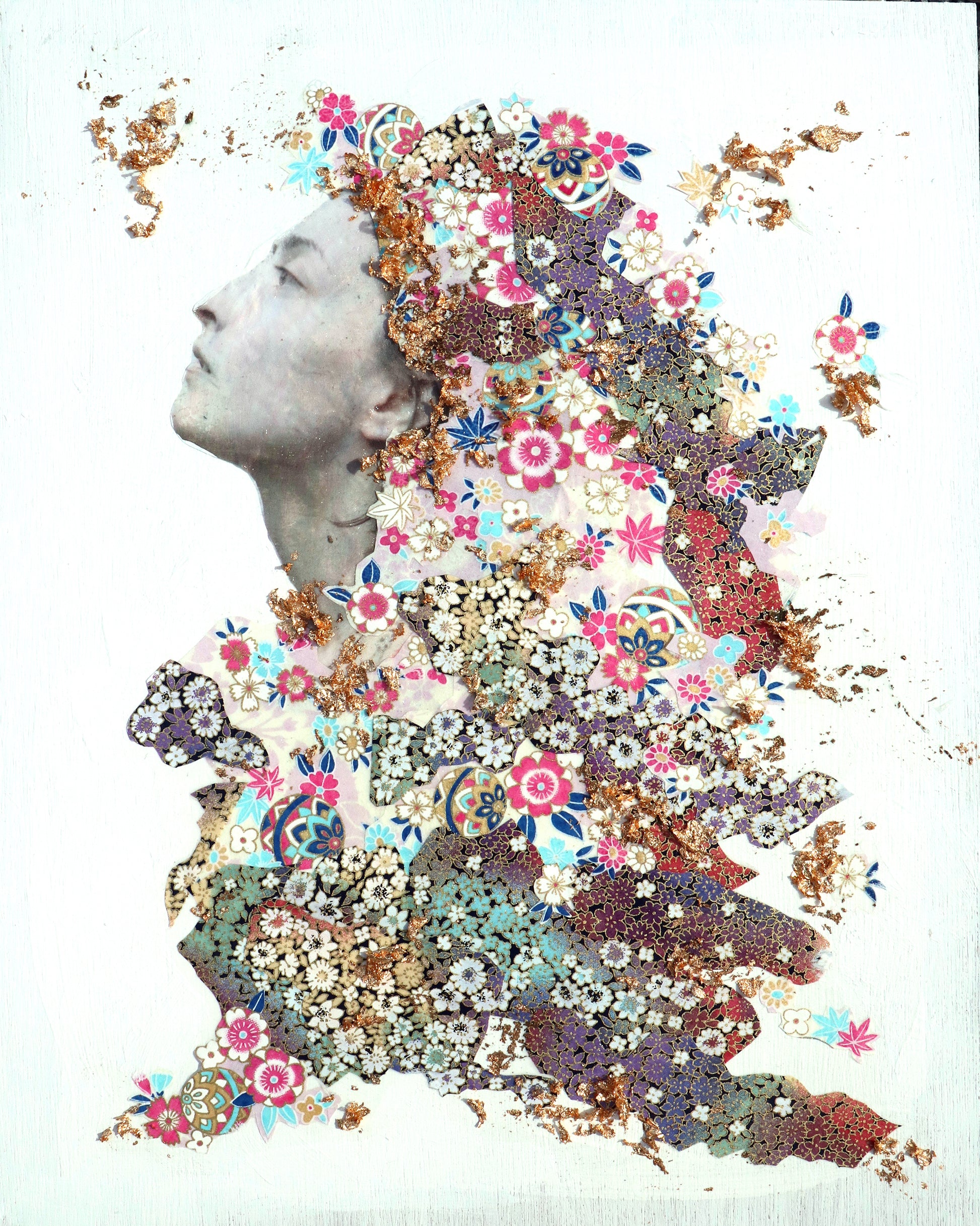 Materials: Wood board, gesso, inkjet print, chiyogami paper, gilding flakes, gel medium