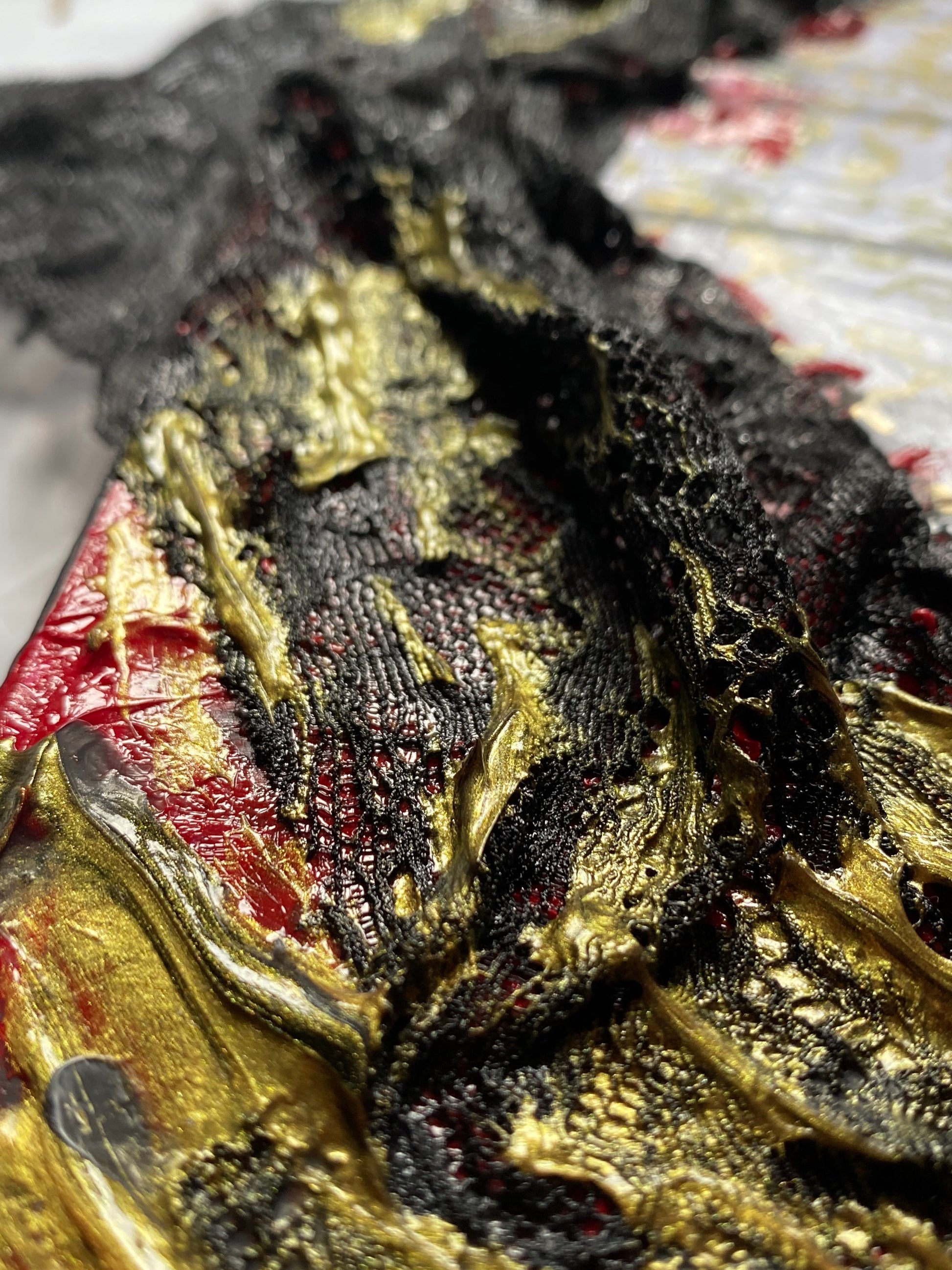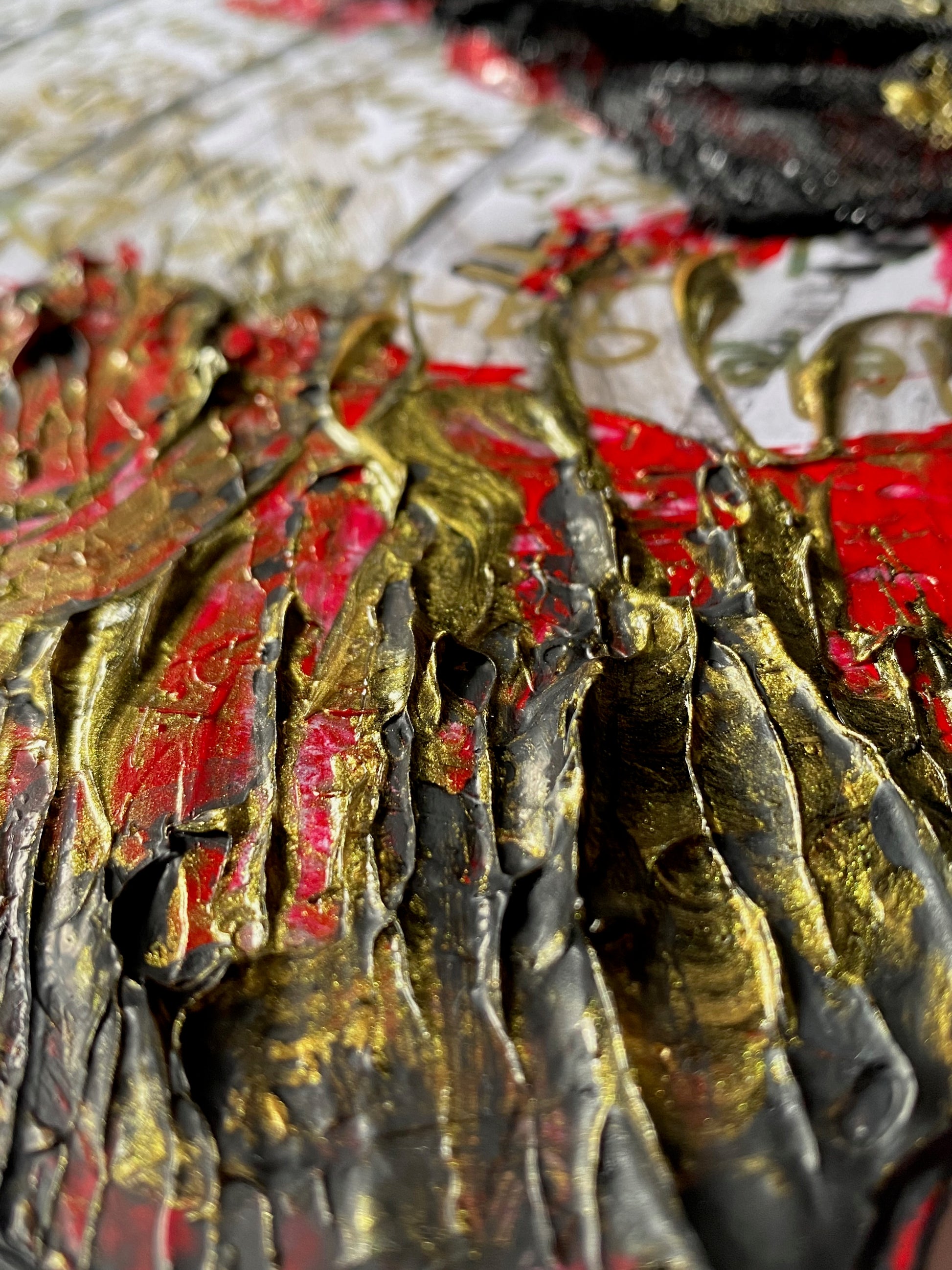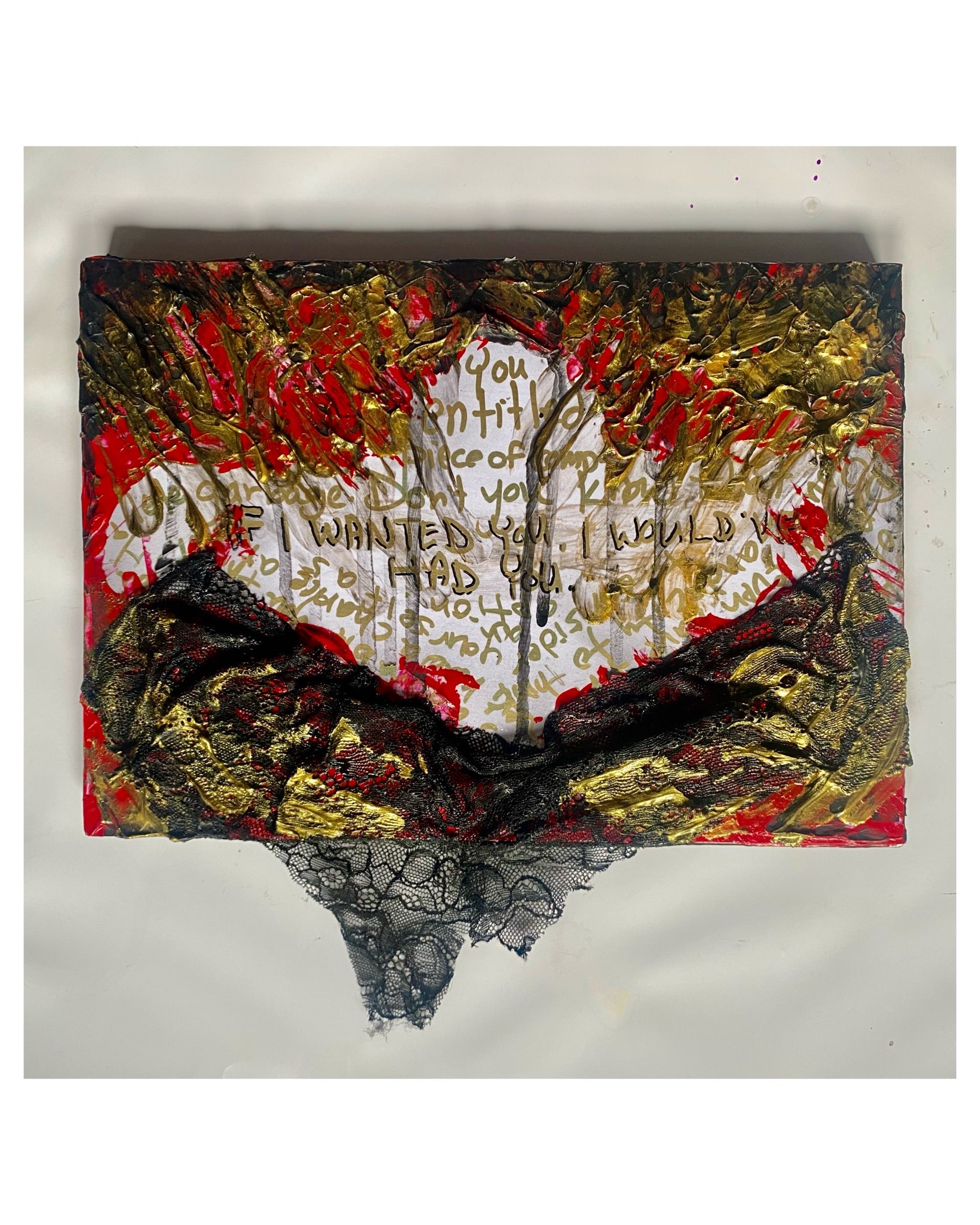 Materials: art panel, digital print, gouache, acrylic paint and gel medium, recycled lace, and a whole lot of anger.