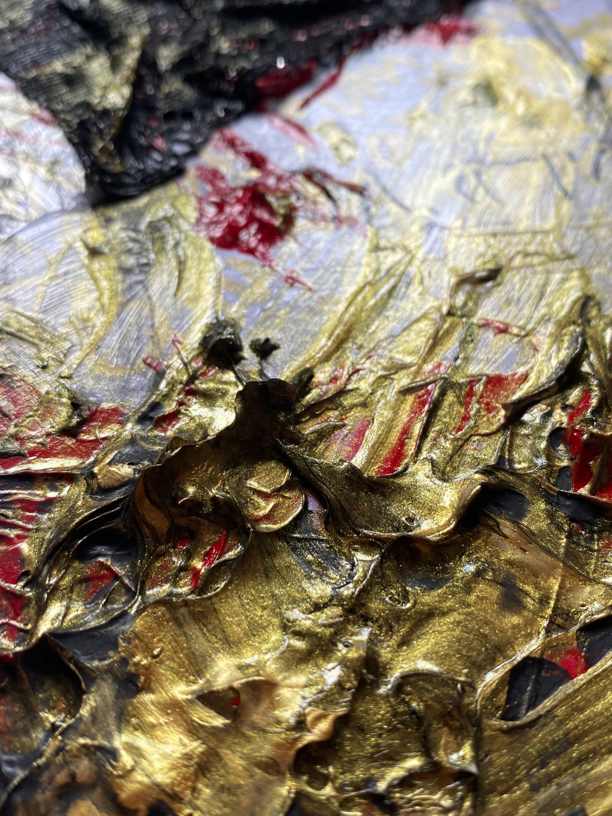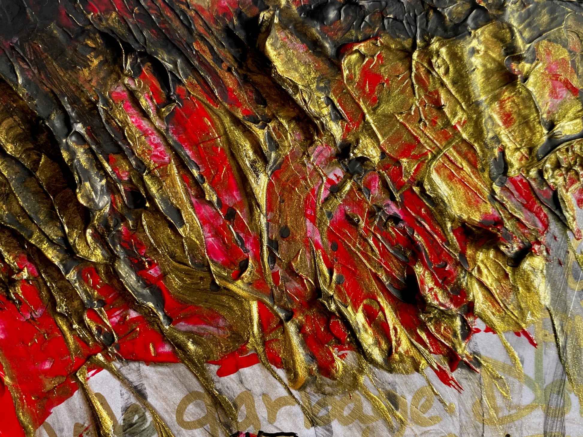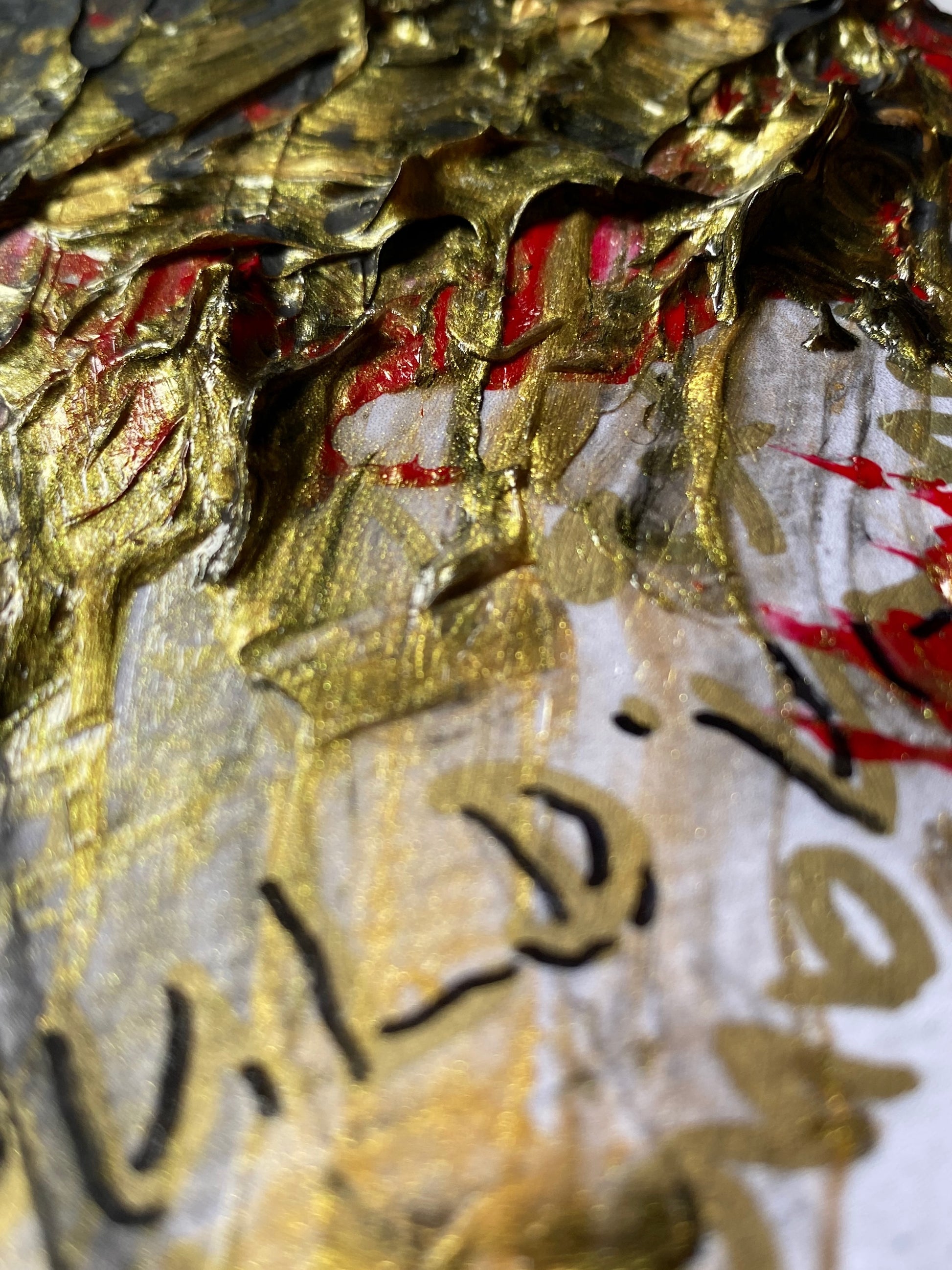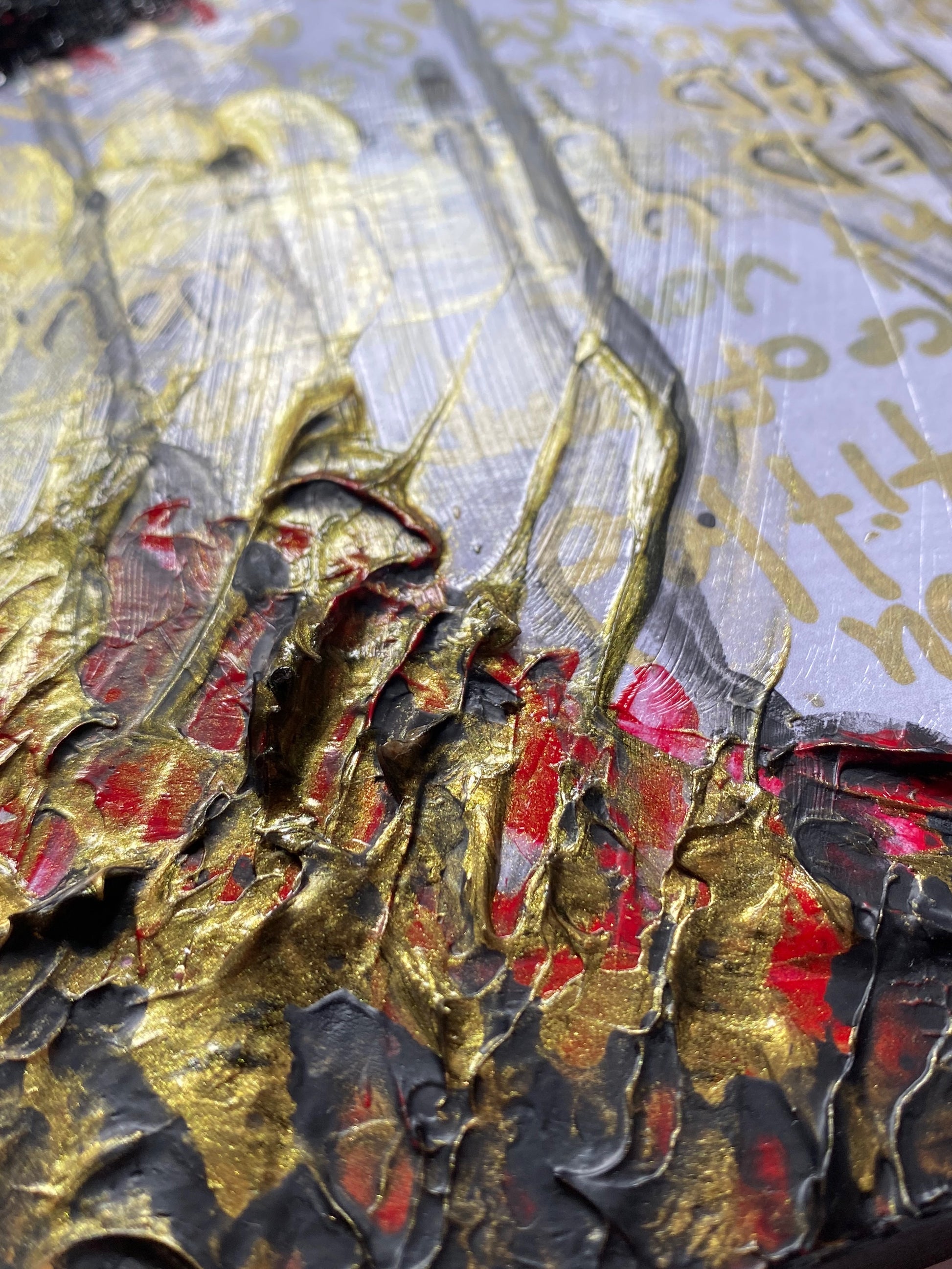Materials: art panel, digital print, gouache, acrylic paint and gel medium, recycled lace, and a whole lot of anger.