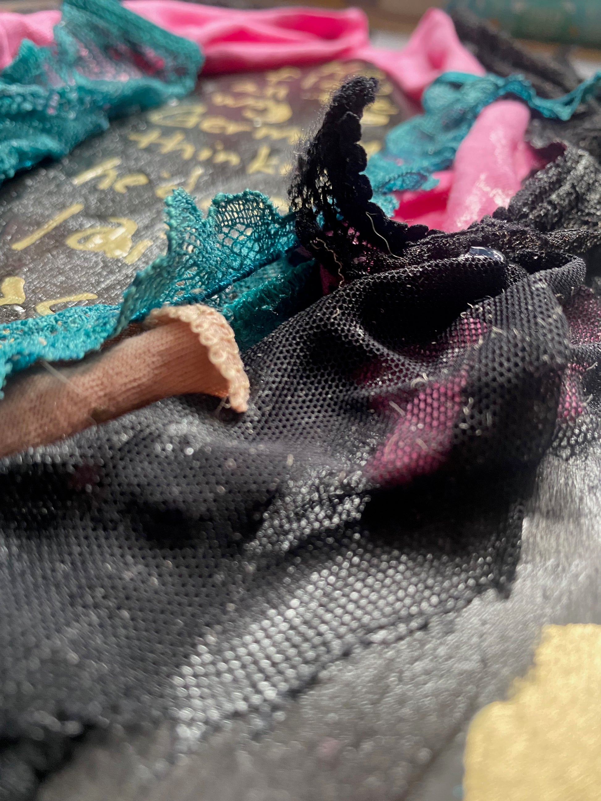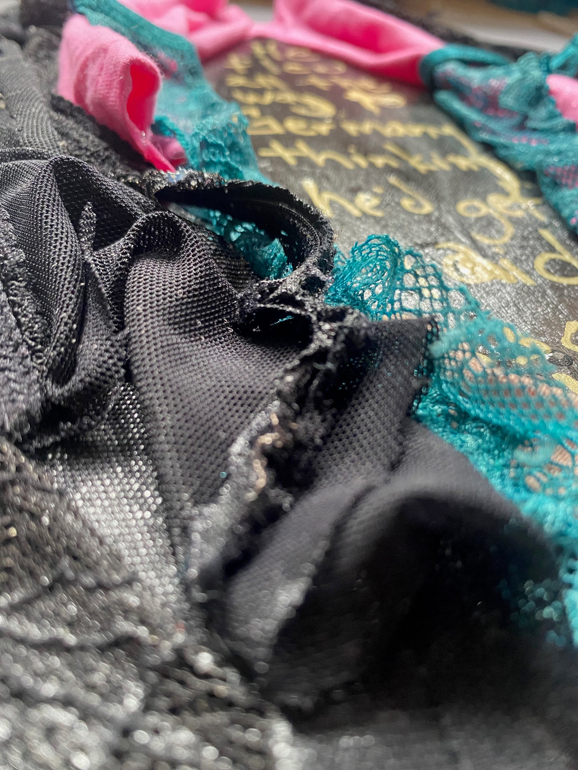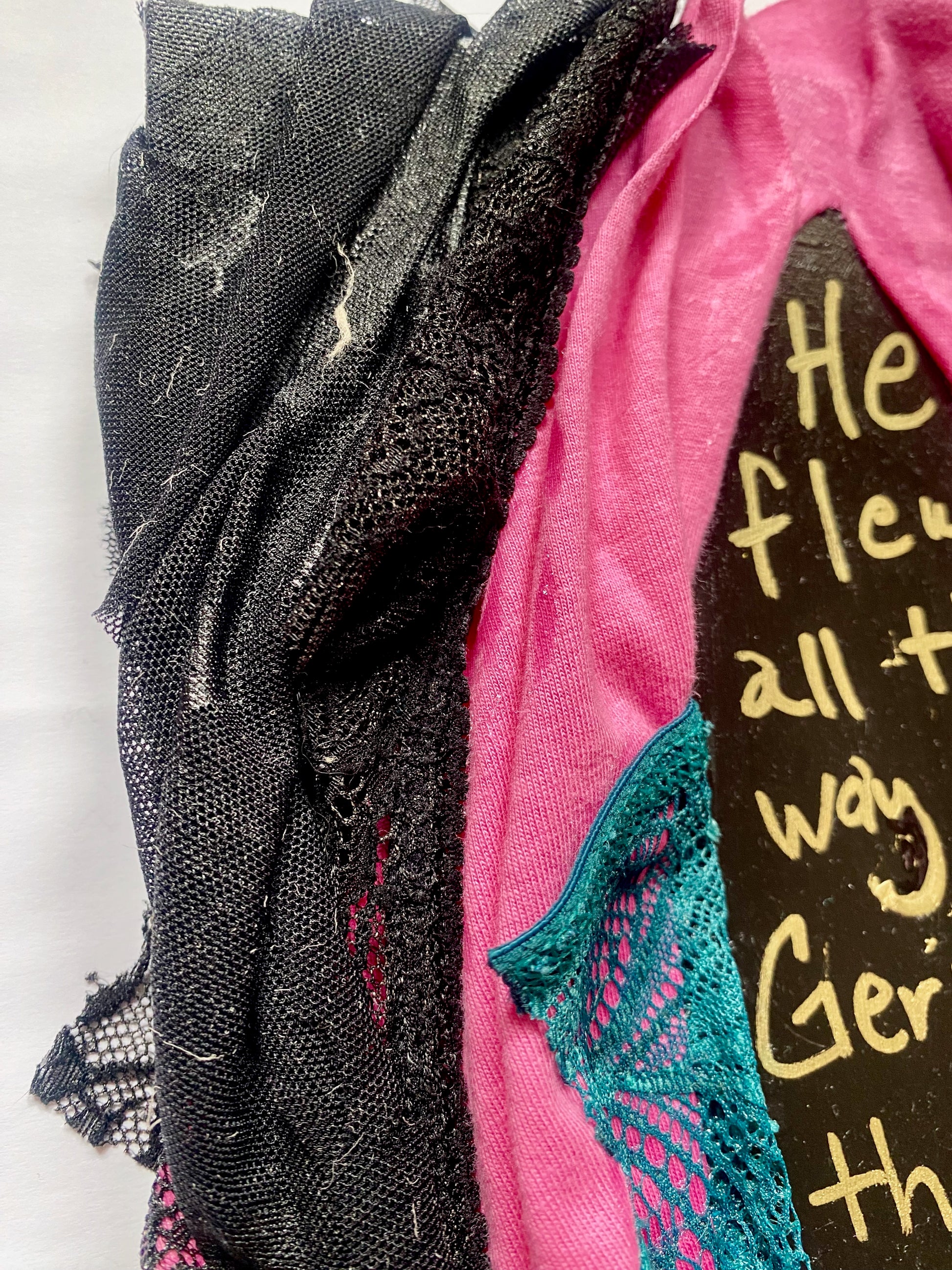 Materials: Art Panel, t-shirt, torn lace and mesh underwear, gel medium, acrylic paint pen