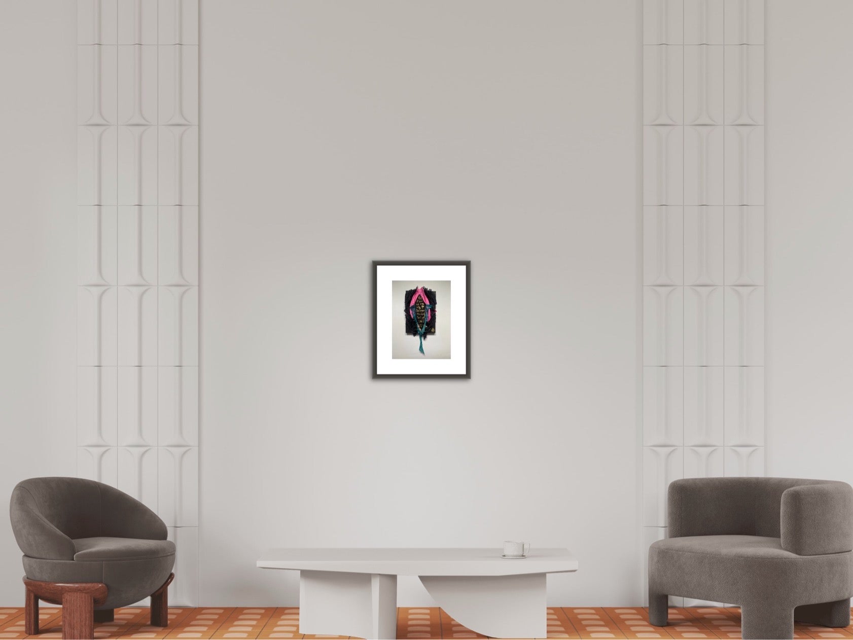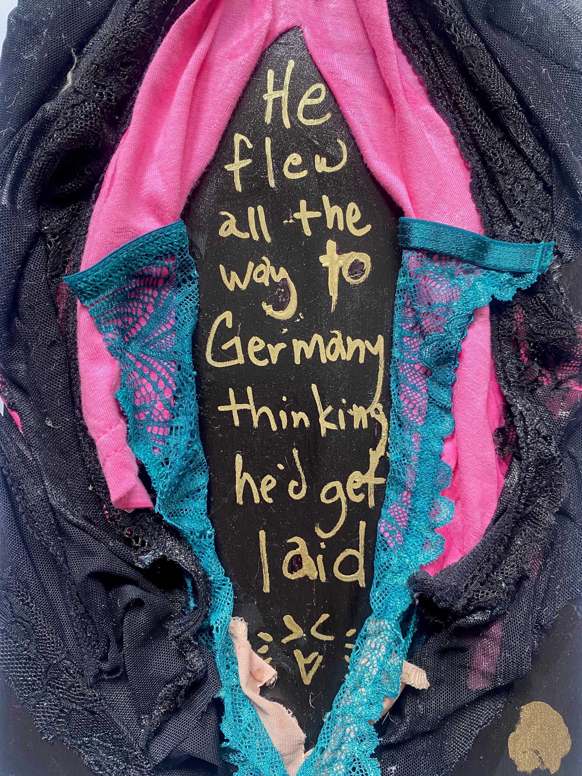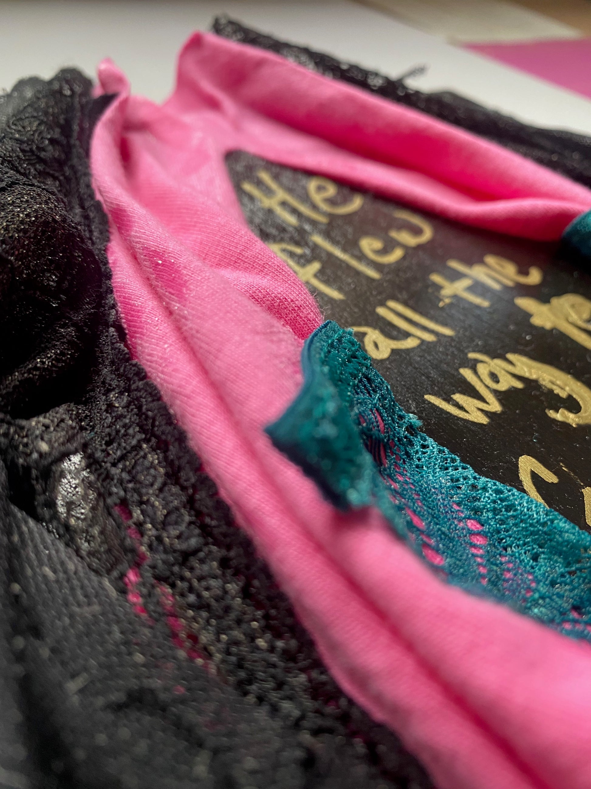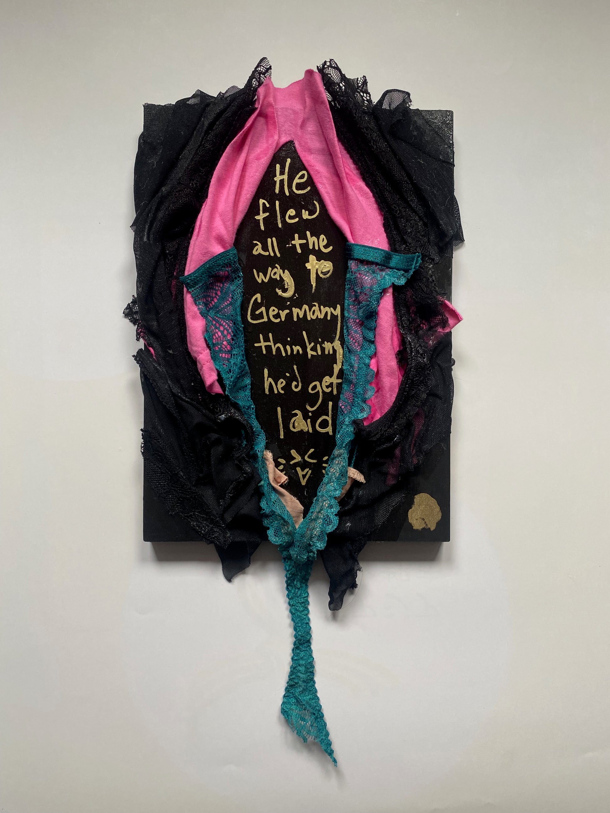 Materials: Art Panel, t-shirt, torn lace and mesh underwear, gel medium, acrylic paint pen