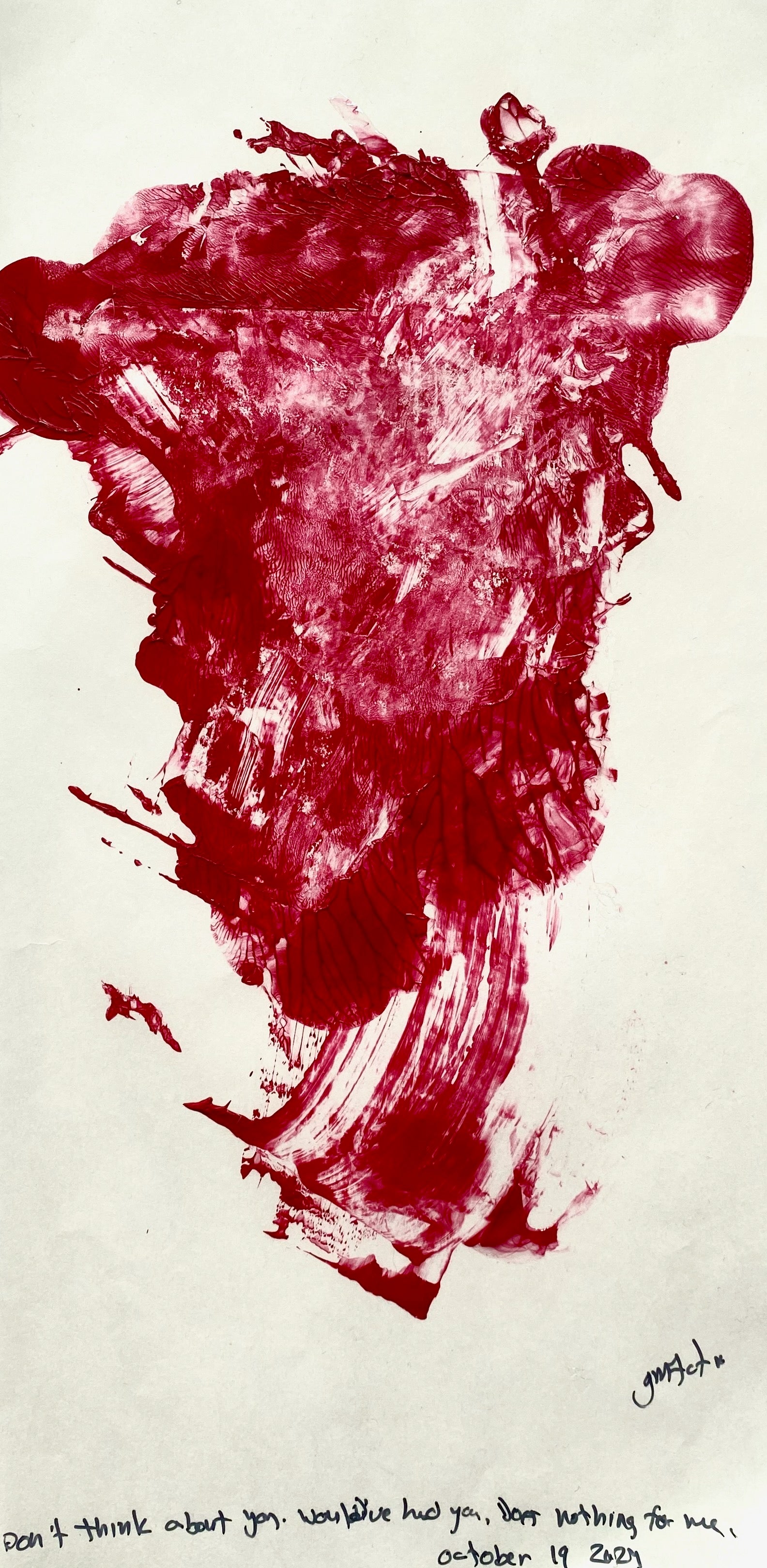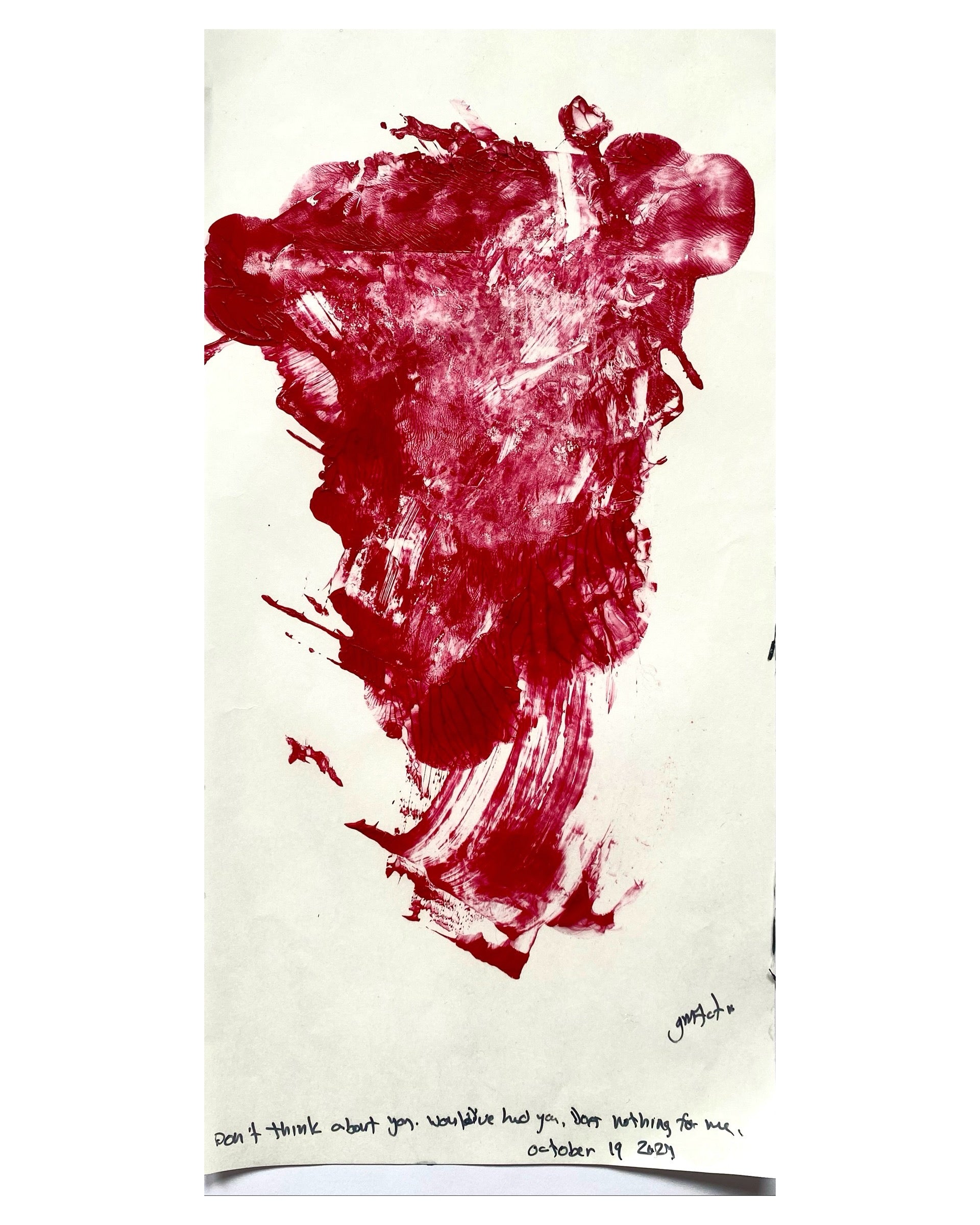 The What Remains artworks for the (currently titled) Anti-Erotic series are artworks made on palette paper with the paint used to create each named artwork. These are abstract pieces made by using the paint for the original and then smearing it around in a mindful, meditative way. Or sometimes letting them play as they fell.